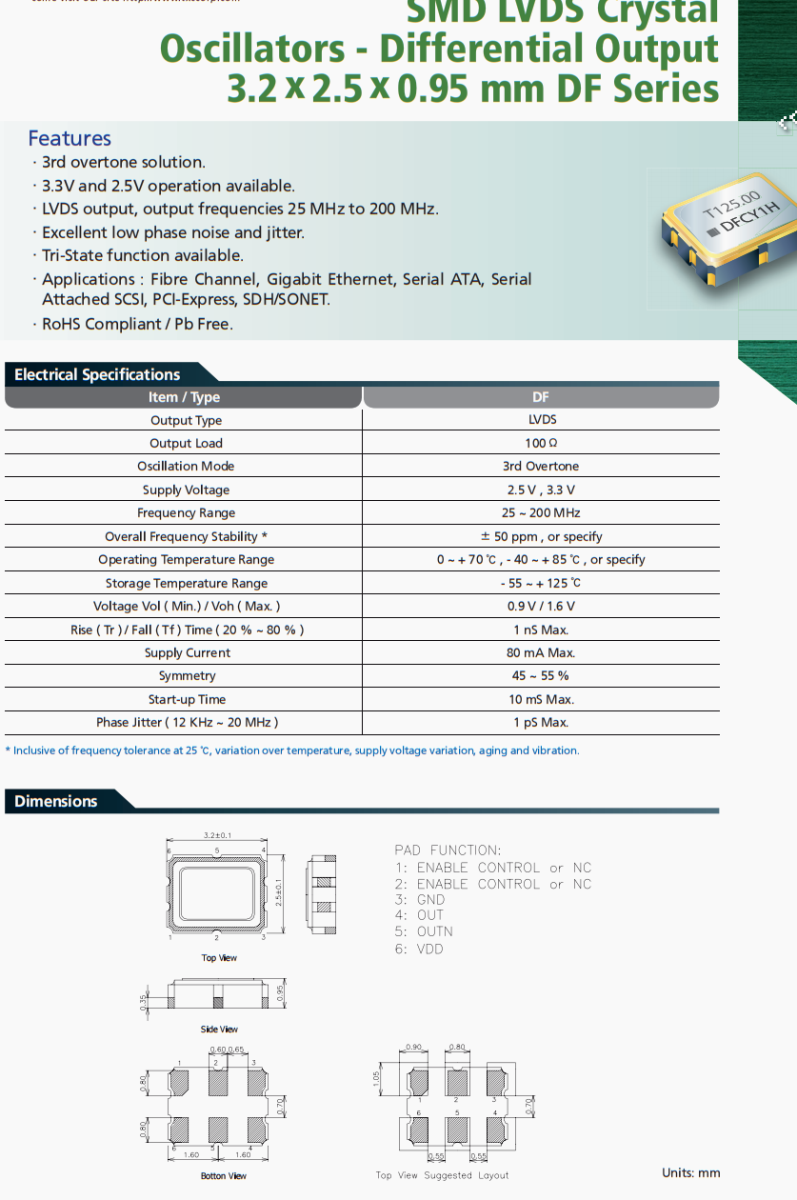 TXC晶振,DFA0000001差分LVDS晶振,DF衛星通信6G晶振,臺灣TXC晶振公司,晶技晶振,石英晶振,貼片晶振,5G設備晶振,6G路由器晶振,高品質晶振,六腳晶振,LVDS晶振,DFA0000001晶振,第三次泛音解決方案,3.3 v和2.5V可選。LVDS輸出,輸出頻率25mhz ~ 200mhz。出色的低相位噪聲和抖動。三態功能。應用:光纖通道,千兆以太網,串行ATA,串行附加SCSI, PCI-Express, SDH/SONET。符合RoHS標準/無鉛。