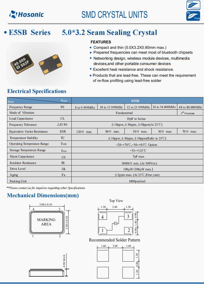 E5SB10E000007E無(wú)源晶振,鴻星低損耗晶振,領(lǐng)先同行的智能網(wǎng)卡晶振,特點(diǎn):輕薄小 (最大5.0x3.2X0.90mm)。準(zhǔn)備好的頻率可以滿足大部分藍(lán)牙芯片組的,網(wǎng)絡(luò)設(shè)計(jì)無(wú)線模塊設(shè)備、多媒體設(shè)備和其他便攜式消費(fèi)設(shè)備·優(yōu)異的耐熱性和抗沖擊性。·無(wú)鉛產(chǎn)品。這些方法可以滿足使用無(wú)鉛焊料進(jìn)行再流分析的要求,臺(tái)灣鴻星晶振公司,貼片晶振,無(wú)源晶振,5032晶振,高精度晶振,高性能晶振,四腳晶振,石英晶振,高品質(zhì)晶振,低損耗晶振,低功耗晶振,藍(lán)牙音箱晶振,智能網(wǎng)卡晶振,智能電表晶振,無(wú)線信號(hào)傳輸設(shè)備晶振,6G局域網(wǎng)晶振,6G衛(wèi)星晶振,北斗導(dǎo)航定位晶振。