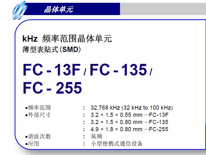 • "FC-135 32.7680KA-A3",晶體產品可能會在某些條件下受到損壞。例如從桌上跌落或在貼裝過程中受到沖擊。如果產品已受過沖擊請勿使用。