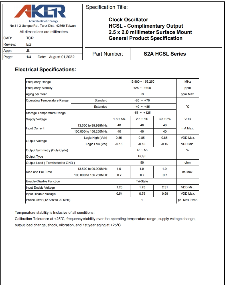 S2A3305-156.250-H-X-R|156.25MHz|3.3V|AKER安基晶振規格表