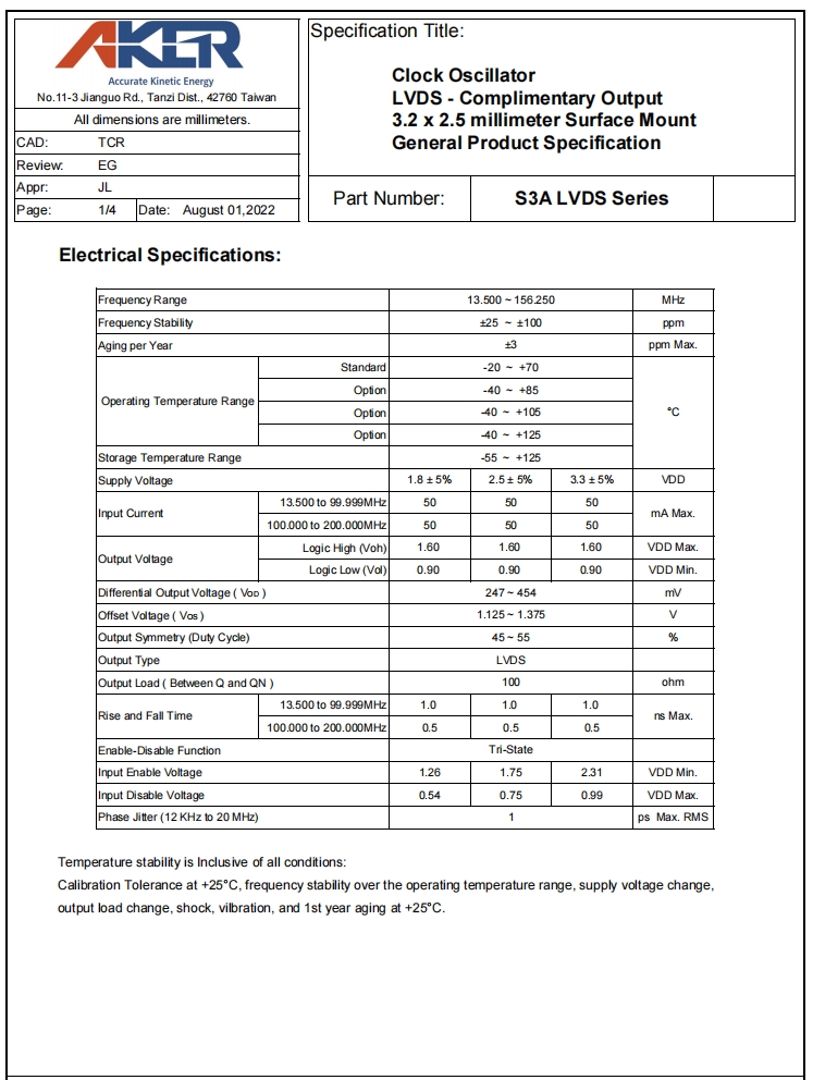 S3A2505-60.000-L-X1-R|60MHz|2.5V|AKER差分晶振規格表