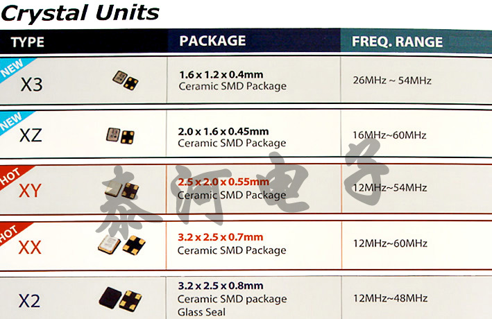 廣泛用途石英晶體(Crystal),小型化貼片晶振(SMD Crystal),一般及精密有源晶振(XO),小型化貼片石英晶體振蕩器(SMD XO)壓控有源晶振(VCXO),壓控溫補振蕩器(VC/TCXO),恆溫石英晶振 (OCXO).