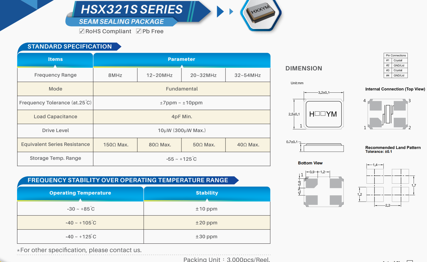 | X3S032000BC1HA-CHPZ | 加高晶振 | HSX321S | 32 MHz | ±10ppm | ±10ppm | 12pF | -30°C ~ 85°C |