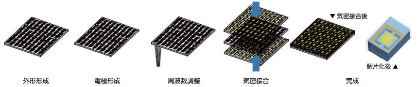 通過使用晶片級(jí)封裝,其中具有諸如通過光刻工藝形成的振動(dòng)部分的外形的三個(gè)石英晶片被接合和單個(gè)化,可以在不使用導(dǎo)電粘合劑的情況下減小保持部分和振動(dòng)部分的厚度。它實(shí)現(xiàn)了整體結(jié)構(gòu)。這解決了伴隨傳統(tǒng)結(jié)構(gòu)中產(chǎn)品的小型化并確保諸如石英晶振元件的安裝位置的余量的提高導(dǎo)電粘合劑的涂覆精度的問題。另外,通過在真空中進(jìn)行晶片清潔和粘合,可以降低質(zhì)量風(fēng)險(xiǎn)。