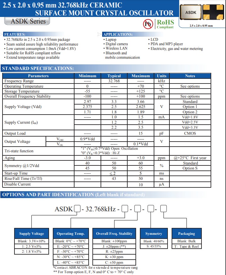 | SXT22410AA27-32.000M | 2.5X2.0 SMD (4 PAD) CRYSTAL | 10pF | ±50ppm | ±50ppm | -20℃ - +70℃ | 32.000M |