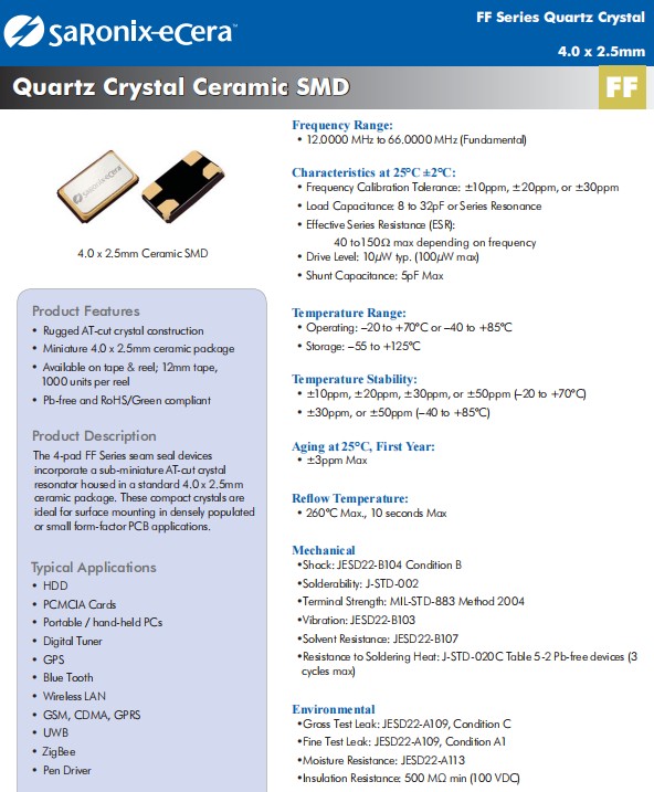Diodes晶振,FF四腳貼片晶振,4025mm晶振,平板電腦晶振,FF系列接縫密封裝置適用于封裝在標(biāo)準(zhǔn)4.0x2.5mm四腳貼片晶振,外殼中的亞微型AT-cut晶體諧振器 陶瓷封裝。這些緊湊型晶體非常適合在密集彈出或小尺寸PCB應(yīng)用中進(jìn)行表面貼裝。堅(jiān)固的AT切割水晶結(jié)構(gòu) 微型4.0x2.5mm毫米陶瓷封裝 提供磁帶和卷軸;12毫米膠帶,每卷1000個(gè),無鉛且符合RoHS/Green標(biāo)準(zhǔn) 。典型應(yīng)用:硬盤驅(qū)動器 PCMCIA卡 便攜式/手持電腦 數(shù)字調(diào)諧器 全球定位系統(tǒng) 碧藍(lán)之牙 無線局域網(wǎng) GSM、CDMA、GPRS 超寬帶 ZigBee 筆驅(qū)動程序.