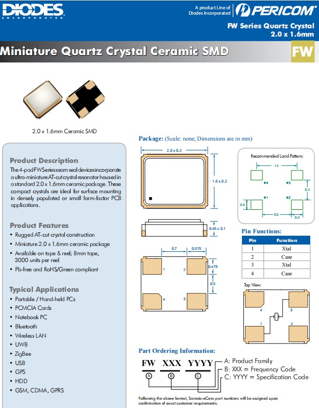 臺灣百利通晶振,FW超小型2016mm晶振,FW1600008石英晶體,FW2500025Z便捷式設(shè)備晶振,四腳貼片晶振FW系列接縫密封裝置包含一個超小型AT切割石英晶體諧振器,封裝在標(biāo)準(zhǔn)2.0x1.6mm陶瓷封裝中。這些緊湊型晶體非常適合密集或小尺寸PCB應(yīng)用中的表面貼裝。堅固的AT切割水晶結(jié)構(gòu) 微型2.0x1.6mm毫米陶瓷封裝 提供磁帶和卷軸;8毫米膠帶,每卷3000個,無鉛且符合RoHS/Green標(biāo)準(zhǔn),典型應(yīng)用于便攜式/手持電腦,PCMCIA卡,筆記本電腦,藍(lán)牙,無線局域網(wǎng),超寬帶 ZigBee USB 全球定位系統(tǒng) 硬盤驅(qū)動器 GSM、CDMA、GPRS。