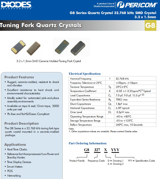 臺灣Diodes晶振,G8系列32.768K晶振,G83270021時鐘晶振,G83270023手表晶振,石英晶體諧振器