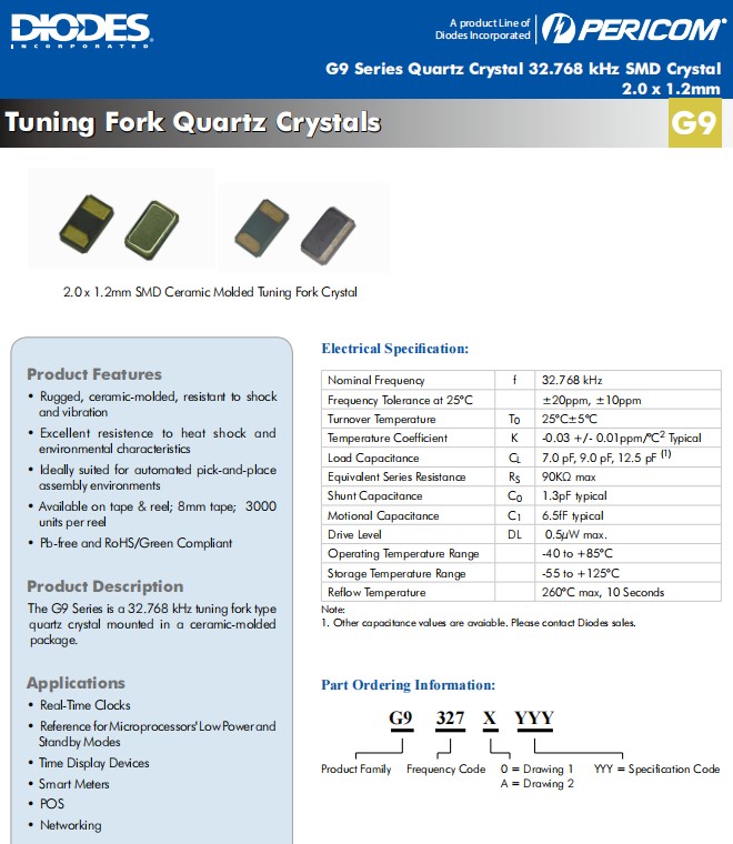 Diodes百利通亞陶晶振,G9系列超小型晶振,G93270001智能手機晶振,G93270004鐘表晶振,2012mm晶振