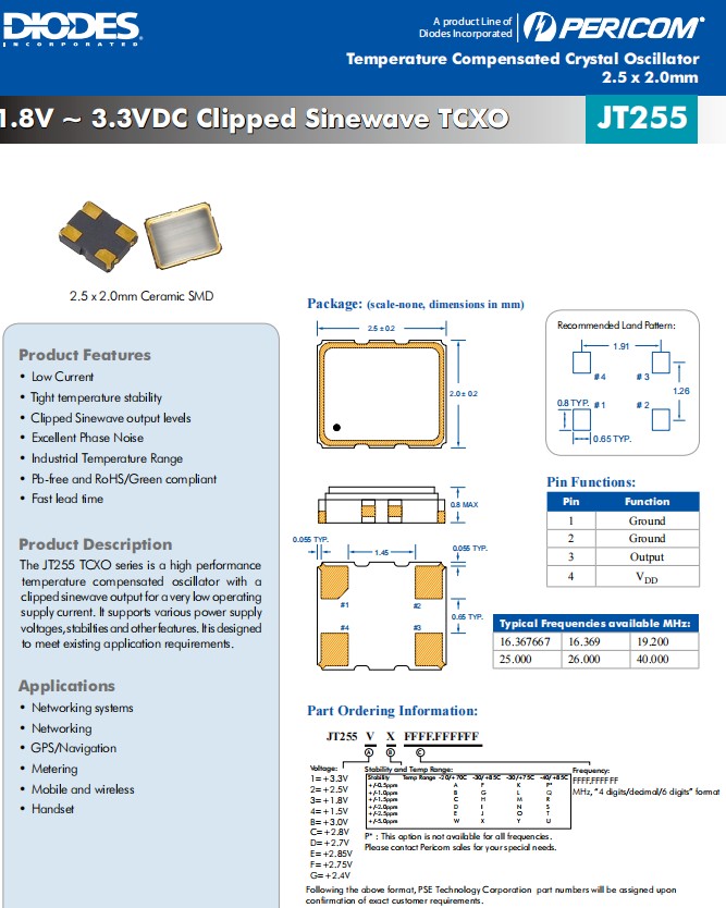 Diodes百利通晶振,JT255溫補晶振,JT255CF0026.000000晶振,JT255BI0032.000000有源晶振,JT255 TCXO系列是一款高性能溫補晶體振蕩器,具有限幅正弦波輸出,工作電源電流非常低。它支持各種電源 電壓、穩定性和其他特性。它旨在滿足現有的應用需求,具有低電流,低抖動,低功耗,嚴格的溫度穩定性,削波正弦波輸出電平,出色的相位噪聲,工業溫度范圍,無鉛且符合RoHS/Green標準,快速交貨時間,應用于網絡系統,網絡 全球定位系統/導航,計量,移動和無線,智能手機等。