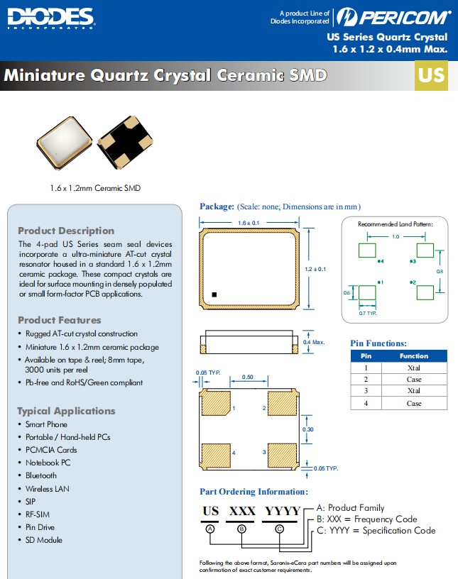 臺灣百利通亞陶晶振,US系列1612mm晶振,US3200005Z通訊晶振,US3840005Z藍牙晶振,無鉛環保晶振,四腳貼片晶振US系列接縫密封裝置包含一個超小型AT切割石英晶體諧振器,封裝在標準的1.6x1.2mm陶瓷封裝中。這些緊湊型晶體非常適合密集或小尺寸PCB應用中的表面貼裝,堅固的AT切割水晶結構,US系列微型1.6x1.2mm毫米陶瓷封裝,提供磁帶和卷軸;8毫米膠帶,每卷3000個,無鉛且符合RoHS/Green標準,典型應用,智能手機,便攜式/手持電腦,PCMCIA卡,筆記本電腦,藍牙,無線局域網,射頻SIM卡,銷驅動,SD模塊。