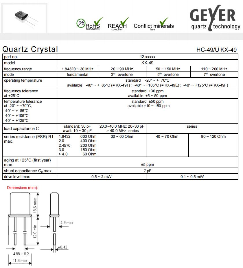 12.81288|7.3728MHz|30pF|格耶插件晶振,格耶晶振,歐美晶振,KX-49進口晶振,無源晶振,12.81288晶振,HC-49/U晶振,石英晶體諧振器,二腳插件晶振,11.3*4.9*13.6mm晶振,頻率7.3728MHz,負載30pF,頻率容差30ppm,工作溫度-20~70°C,無鉛環保晶振,高品質晶振,高可靠性晶振,家用電視機頂盒晶振,移動電話晶振,鍵盤鼠標晶振,電子體重秤晶振.
